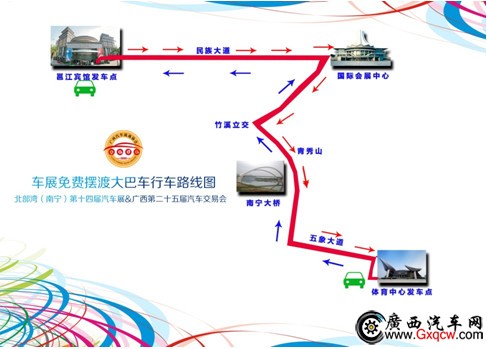 車展期間,主辦方按專設(shè)免費(fèi)擺渡車哦!,項(xiàng)看車的客戶可以每天早上9點(diǎn)-15點(diǎn)在邕江賓館乘坐免費(fèi)公交車前往體育中心。