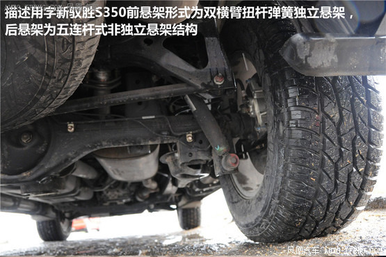 新馭勝S350采用了非承載式車身,前懸架形式為雙橫臂扭桿彈簧獨(dú)立懸架,后懸架為五連桿式非獨(dú)立懸架結(jié)構(gòu)。