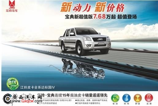 隨著全國國IV標(biāo)準(zhǔn)的切換,江鈴皮卡率先推出了全新的寶典新超值版車型,以國IV標(biāo)準(zhǔn)笑傲群雄。據(jù)悉,寶典新超值版秉承百年福特造車技術(shù),五十鈴發(fā)動機鼻祖,國內(nèi)首創(chuàng)BOSH高壓共軌系統(tǒng)的高品質(zhì)皮卡,成為國內(nèi)首批達標(biāo)國Ⅳ排放的柴油皮卡。而經(jīng)典4JB1柴油機搭載博世高壓共軌和中冷系統(tǒng),以及強效EGR冷卻系統(tǒng),達標(biāo)國Ⅳ,動力強勁,安靜舒適,省油耐用,整車匹配性好等優(yōu)良特性。通過高壓共軌和增壓中冷技術(shù),讓燃油燃燒更加充分,提高發(fā)動機的工作效率,同時通過加裝先進的尾氣處理系統(tǒng),清除尾氣中顆粒和有害氣體排放物,綠色環(huán)保,高效節(jié)能,盡顯領(lǐng)導(dǎo)者風(fēng)范。