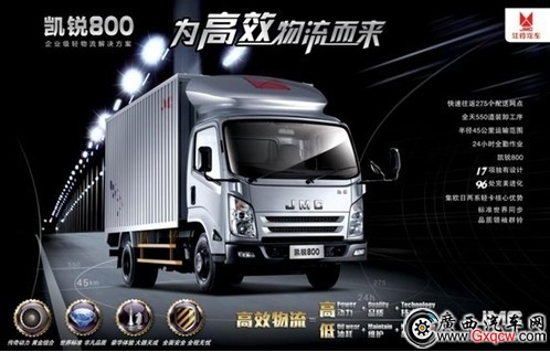 2013年中旬江鈴汽車重磅推出全新一代高端輕卡——凱銳800,凱銳800是在福特體系的滋潤(rùn)下,江鈴?fù)ㄟ^自主研發(fā),集中美日韓等國(guó)專家智慧推出的全新輕卡平臺(tái)產(chǎn)品,也是國(guó)內(nèi)輕卡領(lǐng)域目前最為高端的產(chǎn)品。體現(xiàn)了江鈴與五十鈴、福特多年合作精華的積累沉淀與吸收創(chuàng)新,是歐日美輕型商用車的集大成之作,更是為國(guó)內(nèi)城市物流市場(chǎng)量身訂做的一款物流利器。