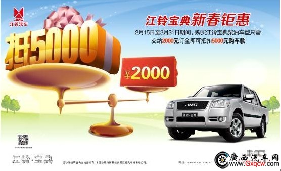 為進(jìn)一步控制機(jī)動車排氣污染,改善城市環(huán)境空氣質(zhì)量,實施國三切換國四政策,江鈴皮卡動力水平、節(jié)油水平、排放水平等全面突破。并全面實現(xiàn)將排放提升到歐Ⅳ水平。截止至4月30日推出超值優(yōu)惠政策,購江鈴寶典皮卡預(yù)交2000元訂金抵5000元購車款優(yōu)惠活動。限時搶購,不要猶豫,馬上到店選購吧!