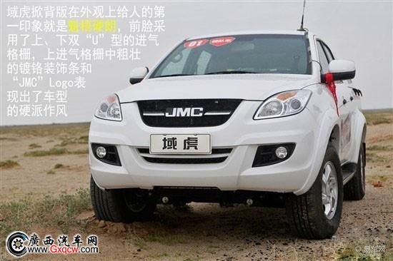 域虎掀背版在外觀上能夠找出不少同平臺(tái)SUV車型馭勝的影子,給人**眼的印象就是魁梧硬朗。前臉采用了上、下雙“U”型的進(jìn)氣格柵,類似于笑臉的造型倒是相當(dāng)具有親和力,不過(guò)上進(jìn)氣格柵中粗壯的鍍鉻裝飾條和“JMC”Logo還是表現(xiàn)出了車型的硬派作風(fēng)。前大燈輪廓并不復(fù)雜,符合車輛的整體定位,近光燈還配有透鏡。車身側(cè)面的迎賓踏板也比較寬大,質(zhì)感不錯(cuò),可以為乘客上下車提供方面,同時(shí)也起到了比較好的裝飾效果。域虎使用的是6輻式鋁合金輪轂,輪胎是瑪吉斯265/70 R16型輪胎,和整車的搭配還算比較協(xié)調(diào)。域虎的后部造型設(shè)計(jì)則偏向運(yùn)動(dòng)風(fēng)格,似乎沒(méi)有了前臉和側(cè)面的霸氣之風(fēng),不管是長(zhǎng)條形尾燈還是后備箱的設(shè)計(jì)都比較精致。貨箱是正方形的設(shè)計(jì),長(zhǎng)寬高分別為1475/1475/500mm?熏后備箱的容積在同級(jí)別車?yán)锊淮蟛恍 ?/p>