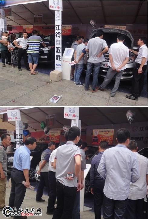 車展開(kāi)幕**天,現(xiàn)場(chǎng)江鈴馭勝銷售人員穿戴整齊的按時(shí)來(lái)到B2展位。此次活動(dòng),廣西云匯派出兩驅(qū)沉穩(wěn)大氣黑色的新馭勝S350,兩驅(qū)銀灰色自動(dòng)擋、兩驅(qū)銀灰新馭勝特裝版和具有王者風(fēng)范白色色掀背版江鈴域虎。江鈴SUV系列均是高端大氣魅力十足的車型,非凡越野能力。同事,也因?yàn)槠澉攘Σ环苍偌由虾廊A購(gòu)車禮迎來(lái)很多朋友的欣賞以及到展位了解,最終訂購(gòu)屬于自己的江鈴SUV。