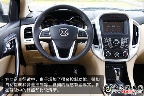 新馭勝S350內(nèi)飾顏色分黑色和米色兩種選擇,全系配備皮革座椅。我們的試駕車采用黑色內(nèi)飾配合銀色裝飾,中控臺(tái)表面采用軟性材料包裹。三幅運(yùn)動(dòng)型多功能真皮方向盤手感優(yōu)良,并配有八按鍵快捷鍵。集中了音響控制、定速巡航、藍(lán)牙電話等功能。整體來說,除了用料差異,新馭勝S350還是營造出了高端車氛圍。