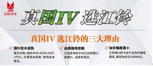 目前,江鈴全系輕卡均已達(dá)標(biāo)國(guó)四。在整個(gè)輕卡行業(yè),江鈴國(guó)四輕卡的加價(jià)幅度最低,最低加價(jià)僅為2000元,相比其它同類產(chǎn)品,江鈴國(guó)四輕卡性價(jià)比優(yōu)勢(shì)明顯。最重要的是,選購(gòu)江鈴真國(guó)四,在已實(shí)施國(guó)四排放標(biāo)準(zhǔn)的地區(qū)不限行,可省去許多后顧之憂。