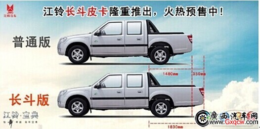 勁爆喜訊!江鈴寶典隆重推出長(zhǎng)貨廂版皮卡,貨廂長(zhǎng)度比普通貨廂加長(zhǎng)了350mm,長(zhǎng)度達(dá)到1830mm。現(xiàn)江鈴長(zhǎng)斗皮卡火熱預(yù)售中,有需求的朋友可到廣西云匯4S店咨詢(xún)了解。咨詢(xún)熱線:0771-3800599/3119811.