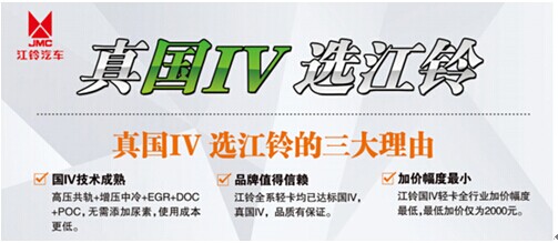 目前,江鈴全系輕卡均已達標(biāo)國四。在整個輕卡行業(yè),江鈴國四輕卡的加價幅度最低,相比其它同類產(chǎn)品,江鈴國四輕卡性價比優(yōu)勢明顯。最重要的是,選購江鈴真國四,在已實施國四排放標(biāo)準(zhǔn)的地區(qū)不限行,可省去許多后顧之憂。