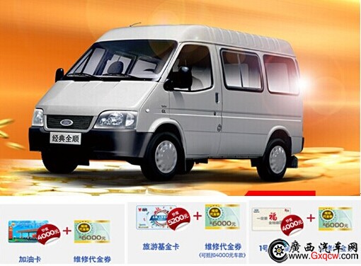二、訂購江鈴經典全順即可享受價值4000元油卡/價值4000元一號店購物卡/價值5200元旅游基金再加6000元維修代金券;
