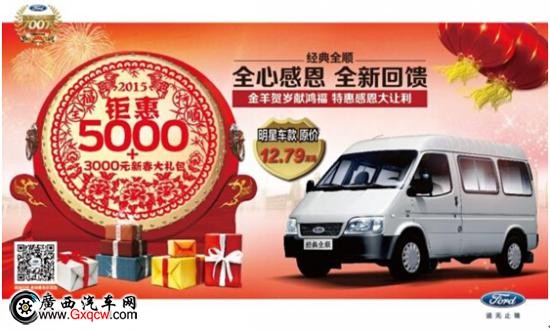 新年新氣象!2015年福特全順全心感恩全新回饋,即日起2月28日期間,凡到店選購經(jīng)典全順多功能車享鉅惠5000元再送價值3000元新春大禮包!感興趣的消費者可以廣西江鈴4S店選購。目前,福特全順官方微信推出了掃底盤號查價活動,速速掃二維碼加入進來吧!