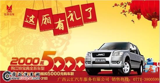 據(jù)獲悉,2015年1~2月份江鈴汽車旗下廣西云匯為答謝廣大用戶的大力支持,隆重推出寶典全系車型購(gòu)車即享3000元現(xiàn)金讓利活動(dòng),真正實(shí)惠百姓,歡迎來(lái)(電)店來(lái)咨詢。咨詢熱線:0771-3800599.