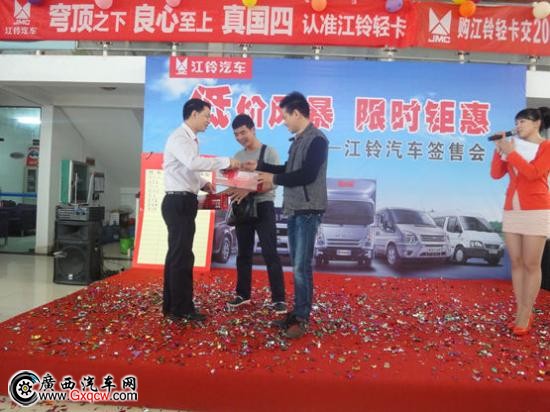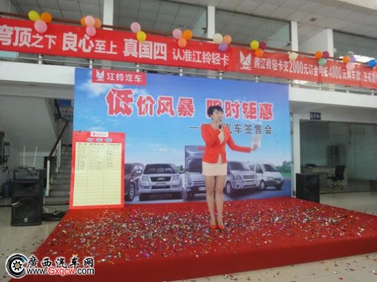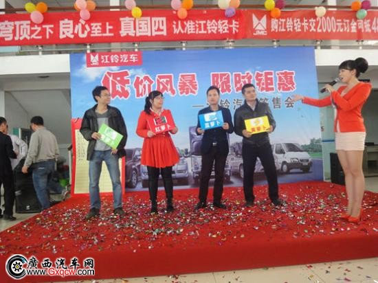 3月28日周六上午廣西江鈴汽車在4S 店內(nèi)舉行江鈴汽車各車系簽單會(huì),并推出開春超值促銷優(yōu)惠,吸引來江鈴眾多新老客戶朋友的關(guān)注。同時(shí),當(dāng)天活動(dòng)現(xiàn)場江鈴伙伴為客戶朋友們精心準(zhǔn)備各種互動(dòng)環(huán)節(jié)也深受在場客戶朋友的喜愛,然而,面對(duì)誘人的優(yōu)惠政策來參與活動(dòng)的朋友也是紛紛在訂車榜上簽訂車信息。*后,簽單會(huì)以較好的訂單量取得圓滿成功。