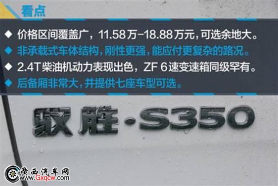 小結(jié):馭勝S350已經(jīng)上市2年了,它的外觀并沒有什么變化,不過時至今日它的外觀也不過時,非承載式車體帶來的高大車身,在同級車型中數(shù)一數(shù)二,不但使其擁有更好的通過性,視覺效果也更霸氣,再加上不俗的設(shè)計,依然符合如今的審美。