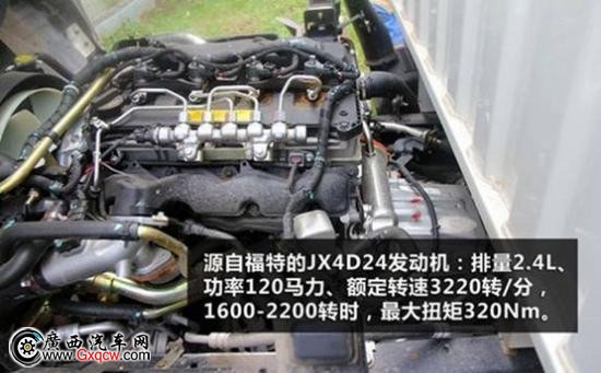 凱銳800發(fā)動機不再沿用早期五十鈴493技術(shù)的發(fā)動機平臺,啟用了JX4D24電控高壓共軌發(fā)動機。配合可變截面渦輪增壓器,通過外置廢氣再循環(huán)系統(tǒng)達到國四排放標準。該款發(fā)動機來源于福特經(jīng)典的PUMA發(fā)動機技術(shù),與路虎衛(wèi)士、新全順所匹配的發(fā)動機系出同門,2.4L排量即可達到120馬力的凈功率,額定轉(zhuǎn)速達到3200轉(zhuǎn)/分,在1600-2200轉(zhuǎn)時,可提供320Nm的*大扭矩。