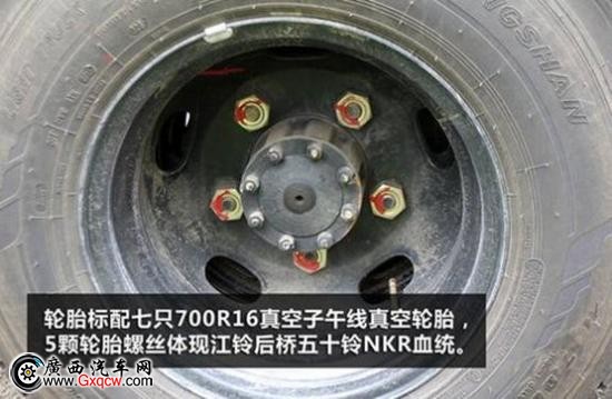 后橋采用了五十鈴NKR技術(shù)的加強橋,輪胎標配七只700R16真空子午線真空輪胎,全部帶有動平衡鉛塊,5顆輪胎螺絲將江鈴凱銳800后橋的五十鈴NKR血統(tǒng)表現(xiàn)得一覽無遺。