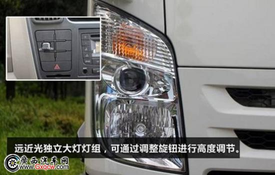 遠近光獨立的大燈燈組,近光燈采用了透鏡式。大燈組可以通過駕駛室內(nèi)的調(diào)整旋鈕進行高度調(diào)節(jié),方便駕駛員在空、重車時對燈光的照射角度進行修正,避免重車時燈光仰起而影響對方來車的視線。這也是一種安全和禮貌行車的表現(xiàn),畢竟與人以便也就是對自己的保護。