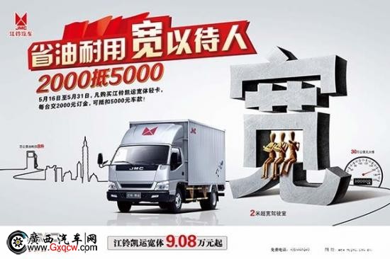 據(jù)獲悉,即日起至5月31日到廣西江鈴4S店購(gòu)江鈴凱運(yùn)寬體即享存2000元至少抵5000元的限時(shí)優(yōu)惠活動(dòng),限時(shí)鉅惠,歡迎廣大感興趣的客戶(hù)朋友抓緊時(shí)間到店搶購(gòu)。咨詢(xún)熱線:0771-3119811.