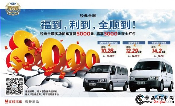 據(jù)獲悉,即日起至6月30日到廣西江鈴安吉4S店購(gòu)江鈴經(jīng)典全順指定車系即享超值豪禮,先到先得,趕快到店搶購(gòu)吧!江鈴福特全順載您一路順到底!咨詢熱線:0771-3119811.