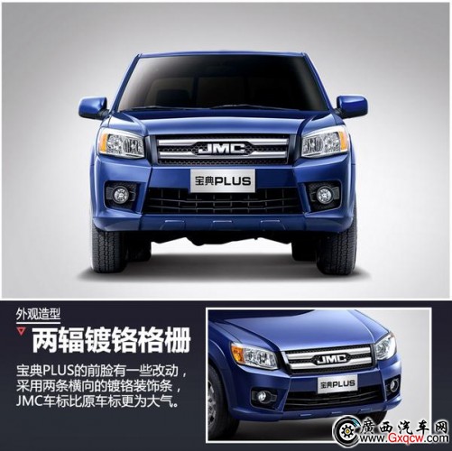 寶典PLUS的前臉有一些改動,采用兩條橫向的鍍鉻裝飾條,JMC車標比原車標更為大氣,配合黑色蜂窩式進氣格柵,使得前臉與寶典形成明顯差異。寶典PLUS尾部進行細節(jié)上的處理,除了尾部門把手周圍增加了一些裝飾外,細節(jié)主要還是體現(xiàn)在一款樣式新穎并與外繩鉤一體的龍門架上。