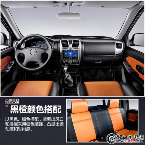 江鈴汽車針對消費者的喜好,將寶典PLUS的內(nèi)飾風格進行升級。主要以黑色、銀色搭配,空調(diào)出風口和排擋采用銀色裝飾,凸顯出運動感和時尚感。座椅以及車門把手周圍被大面積橙色覆蓋,搭配一些暖色系縫制線,視覺沖擊效果很強,讓內(nèi)飾整體充滿活力。中控臺空調(diào)出風口和空調(diào)調(diào)節(jié)旋鈕之間配備了具有MP5功能的大屏幕,對江鈴皮卡而言提升很大。