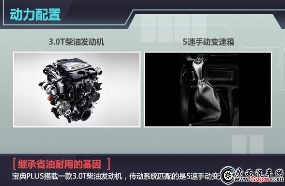 作為寶典家族的一員,寶典PLUS同樣繼承了寶典一貫省油耐用的基因,發(fā)動機和底盤耐用度已經(jīng)有口皆碑,畢竟皮卡還是一輛工具車。另一個大亮點,寶典PLUS搭載全新的3.0T柴油發(fā)動機,*大功率92kw,峰值扭矩280N.m。低速高扭的特性,無論拉貨、加速還是過坑過坎都游刃有余,保證用車的燃油經(jīng)濟性,傳動系統(tǒng)匹配的是5速手動變速箱。