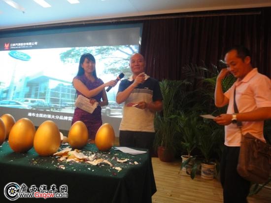 現(xiàn)場(chǎng)訂車客戶交完定金即可參與百分百中獎(jiǎng)扎金蛋活動(dòng),此次活動(dòng)江鈴還準(zhǔn)備了激動(dòng)人心的現(xiàn)場(chǎng)微信搶紅包,游戲贏紅包及抽獎(jiǎng)等互動(dòng),使得現(xiàn)場(chǎng)氣氛活躍,原本持金觀望的客戶也果斷到訂車處辦理訂車并上臺(tái)砸金蛋贏豪禮,可謂大快人心。*后還給江鈴每一組客戶們準(zhǔn)備一份精美的紀(jì)念理。
