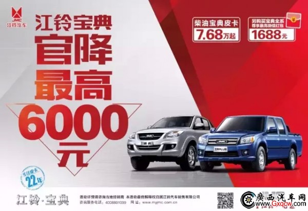 近日,廣西江鈴汽車為迎接2016新年到來,即日起至1月31日提前享受購寶典指定車系*高享現(xiàn)金直降6000元,同時還可參與“百分百中獎“微抽紅包,紅包金額*高可達1688元,且抽取紅包金額可直接抵扣等額購車款。新年優(yōu)惠提前享,盡在廣西江鈴寶典皮卡,歡迎廣大欲購車的朋友到安吉4S店搶購,咨詢熱線:0771-3119811.