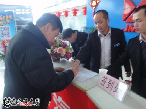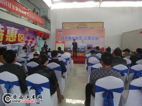 簽單會活動正式開始,廣西江鈴品牌經(jīng)理吳經(jīng)理致辭,并宣布此次活動促銷優(yōu)惠政策。