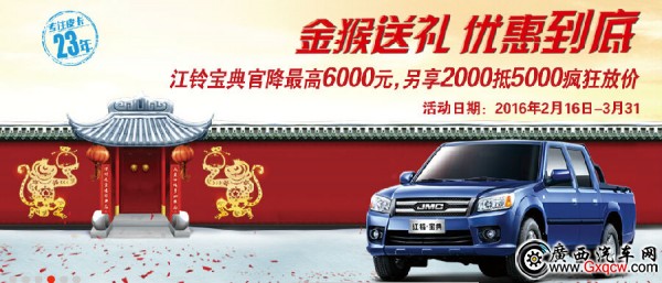 近日,小編走訪廣西江鈴安吉4S店了解到,即日起至3月31日到店購江鈴寶典皮卡即可享預(yù)交2000元訂車款抵5000元購車款優(yōu)惠,限時(shí)鉅惠,歡迎廣大朋友來店咨詢了解。咨詢熱線:0771-3119811.