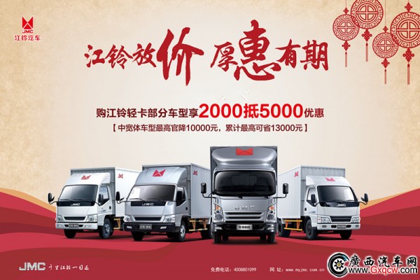 據(jù)獲悉,即日起至5月31日到廣西江鈴安吉4S店購江鈴輕卡即可享受預(yù)交2000定車款抵5000元購車限時搶購,歡迎感興趣的朋友來店選購,咨詢熱線:0771-3119811.