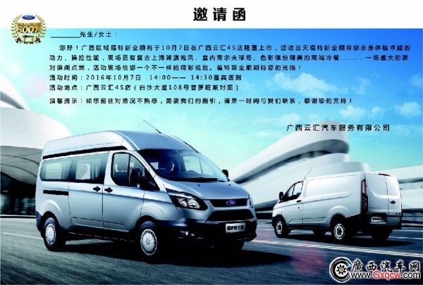 據(jù)悉,9月21日,宣布正式上市的福特新全順剛一亮相,售價11.93萬起的福特新全順,越世登場!廣西云匯4S店新車上市發(fā)布會于10月7日在店內(nèi)舉行,活動期間更有您意想不到的優(yōu)惠哦!同時現(xiàn)場更有上海灘旗袍風(fēng),等室內(nèi)游戲等您來挑戰(zhàn)觀摩,我們在廣西云匯4s店期待您的光臨,咨詢熱線:0771-3800599!
