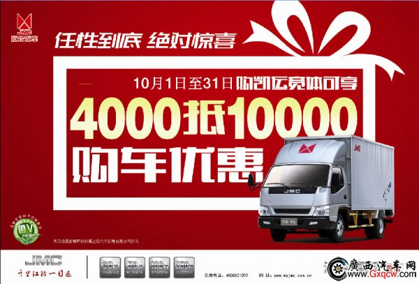 喜迎國(guó)慶,震撼優(yōu)惠,10月1日至31日到廣西江鈴安吉4店購(gòu)買江鈴凱運(yùn)寬體車型立享交4000元抵10000元優(yōu)惠。您還在等什么?趕快來店(電)訂購(gòu)吧!經(jīng)銷商熱線:0771-3119811.