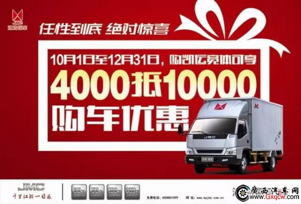 據(jù)獲悉,即日起至12月31日廣西江鈴輕卡指定車系購車立享年度超值優(yōu)惠,即交4000元購車訂金抵10000元購車款,您還在猶豫什么?快快來店選購吧!詳情咨詢熱線:0771-3119811.