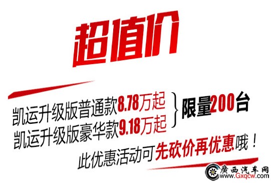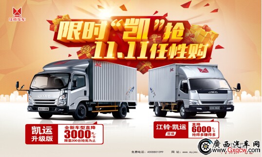 江鈴輕卡之家雙十一豪禮送不停,卡車雙十一網(wǎng)購提供200臺(tái)N720(凱運(yùn)升級(jí)版);*高優(yōu)惠3000元,限“凱”搶購,搶購時(shí)間截止2016年11月15日,手快有手慢就沒了哦!抓緊時(shí)機(jī)搶購吧!搶購請(qǐng)咨詢熱線:0771-3119811