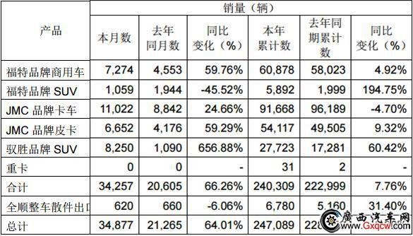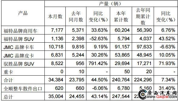 今年11月,江鈴汽車(chē)所有整車(chē)車(chē)型產(chǎn)品銷(xiāo)量為34,257輛,同比增長(zhǎng)66.26%;全部整車(chē)車(chē)型今年前十個(gè)月份累計(jì)銷(xiāo)量為240,309輛,同比增長(zhǎng)7.76%。