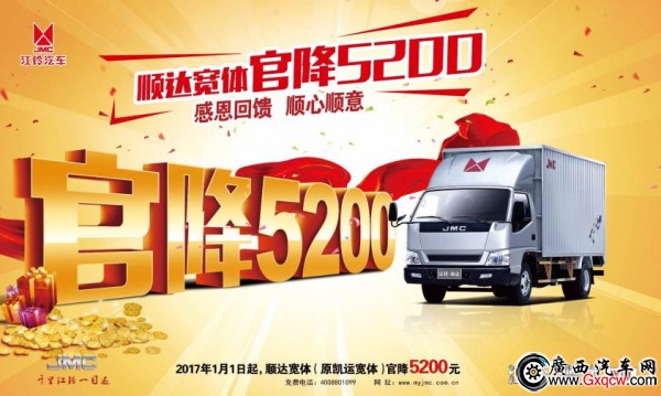 新年新氣象!2017年江鈴順達(dá)寬體(原凱運(yùn)寬體)全心感恩全新回饋,自1月1日到1月31日期間,到店選購江鈴順達(dá)寬體(原凱運(yùn)寬體)享鉅惠5200元,現(xiàn)場(chǎng)購車還有砸金豬,百分百中獎(jiǎng),驚喜多多!感興趣的車友們歡迎來店來電咨詢。銷售熱線:0771-3119811