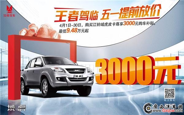4月1日,小編剛一上班便聽到同事驚呼:“江鈴域虎皮卡的促銷季終于來了!”從起床就謹記今天是愚人節(jié)的小編**反應(yīng)就是“你一定是在騙我,我才不信”,正當小編再三強調(diào)自己不會上當?shù)臅r候,同事甩來一張江鈴的優(yōu)惠海報,小編這才相信這不是一個玩笑。繼去年的增配調(diào)價之后,江鈴再為優(yōu)惠力度加碼:4月1日-30日,購買江鈴域虎皮卡尊享3000元購車補貼,最低9.48萬元起!