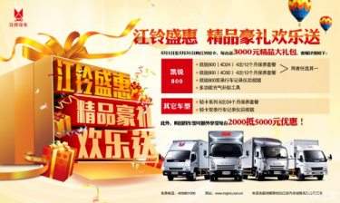 5月,江鈴輕卡看頭不少,凱運升級版氣剎車型繼續(xù)在全國各地強勢登陸,現(xiàn)場人氣爆棚,同時,全系輕卡購車優(yōu)惠再度升級,5月1日至5月31日,購全系江鈴輕卡指定車型,即享每臺送3000元精品大禮包,購國四車型額外享受每臺2000抵5000元優(yōu)惠,掐指一算,兩項優(yōu)惠疊加一起*高可享6000元優(yōu)惠,非一般的劃算。
