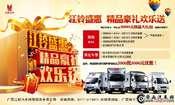 初夏禮遇江鈴,為回饋廣大消費(fèi)者對(duì)江鈴輕卡長期支持和信賴,即日起凡購買江鈴全系國四輕卡立享2000抵5000元優(yōu)惠,同時(shí),再享價(jià)值3000元精品大禮包,此次促銷車型陣容強(qiáng)大,對(duì)于有購車打算的用戶來講,是一個(gè)不容錯(cuò)過的搶購好時(shí)機(jī)會(huì)喔!咨詢熱線:0771-3119811.