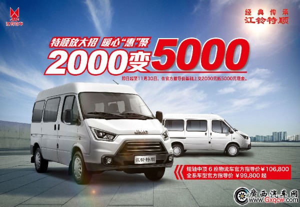 即日起至11月30日,在官方指導(dǎo)價(jià)基礎(chǔ)上交2000元即可抵5000元現(xiàn)金。江鈴特順官方指導(dǎo)價(jià)9.98-13.92萬,主流車型短軸中頂6座物流車官方指導(dǎo)價(jià)僅10.68萬。