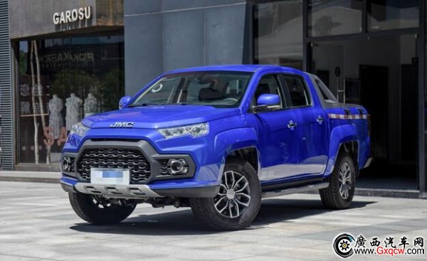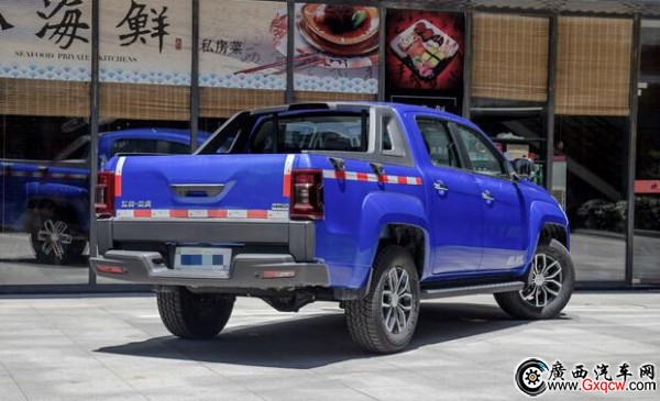 前臉采用了與猛禽相似的大尺寸進氣格柵,調(diào)高的底盤使得其有著不錯的接近角和離去角。側(cè)面車使用雙門設(shè)計,后部的貨箱也使用了熟料材質(zhì)包裹。可惜的是,江鈴為其配備了小尺寸的輪轂,略微顯得小氣。