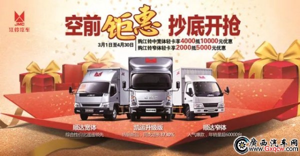 即日起至4月30日購(gòu)順達(dá)窄體享2000抵5000元優(yōu)惠購(gòu)順達(dá)寬體、凱運(yùn)升級(jí)版享4000抵10000元超值優(yōu)惠;參與優(yōu)惠的車型均是滿足國(guó)五排放標(biāo)準(zhǔn)的優(yōu)質(zhì)車型。咨詢熱線:0771-3119811