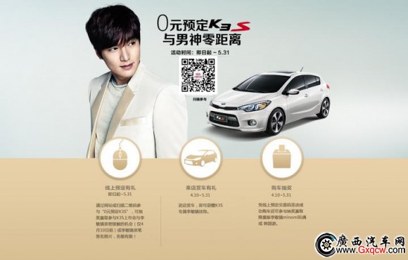 驚喜五:線上預定有禮: 活動期間,通過網(wǎng)站或掃描二維碼參與“0元預定K3S”,可抽獎贏取參與K3S上市會與李敏鎬親密接觸的機會(僅4月10日前) 或 李敏鎬親筆簽名照片,名額有限!