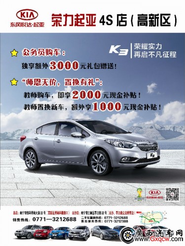 榮力起亞4S店將于8月16-17日開展“榮力起亞公務員、教師團購季”活動;顒悠陂g憑單位工作證訂購任意款車型即可享受公務員、教師購車特價,購車享專項補貼,還有購車抽獎,貸款享零利息等。此活動是廠家針對公務員及教師推出的專項購車優(yōu)惠補貼,由廠家直銷讓利給消費者。此活動僅限榮力起亞4S店舉辦,機會難得!讓您買得放心,用得安心!活動地址:南寧市快環(huán)秀廂大道22號(高新區(qū))活動咨詢專線:0771-3212688