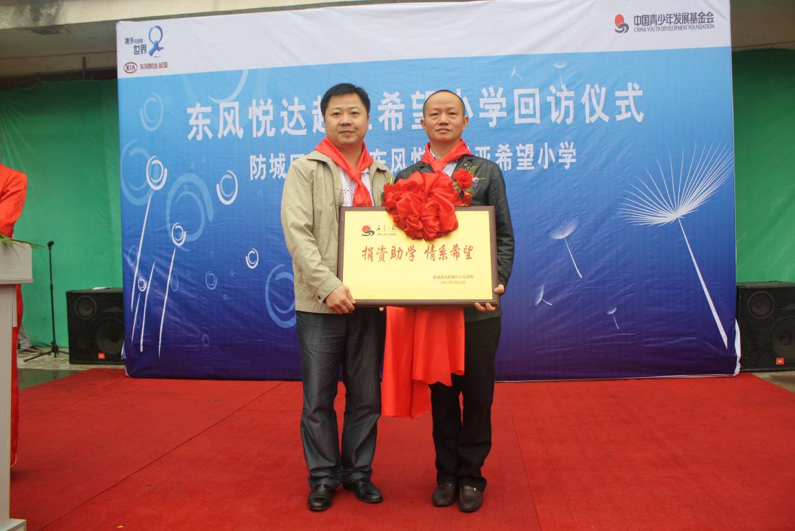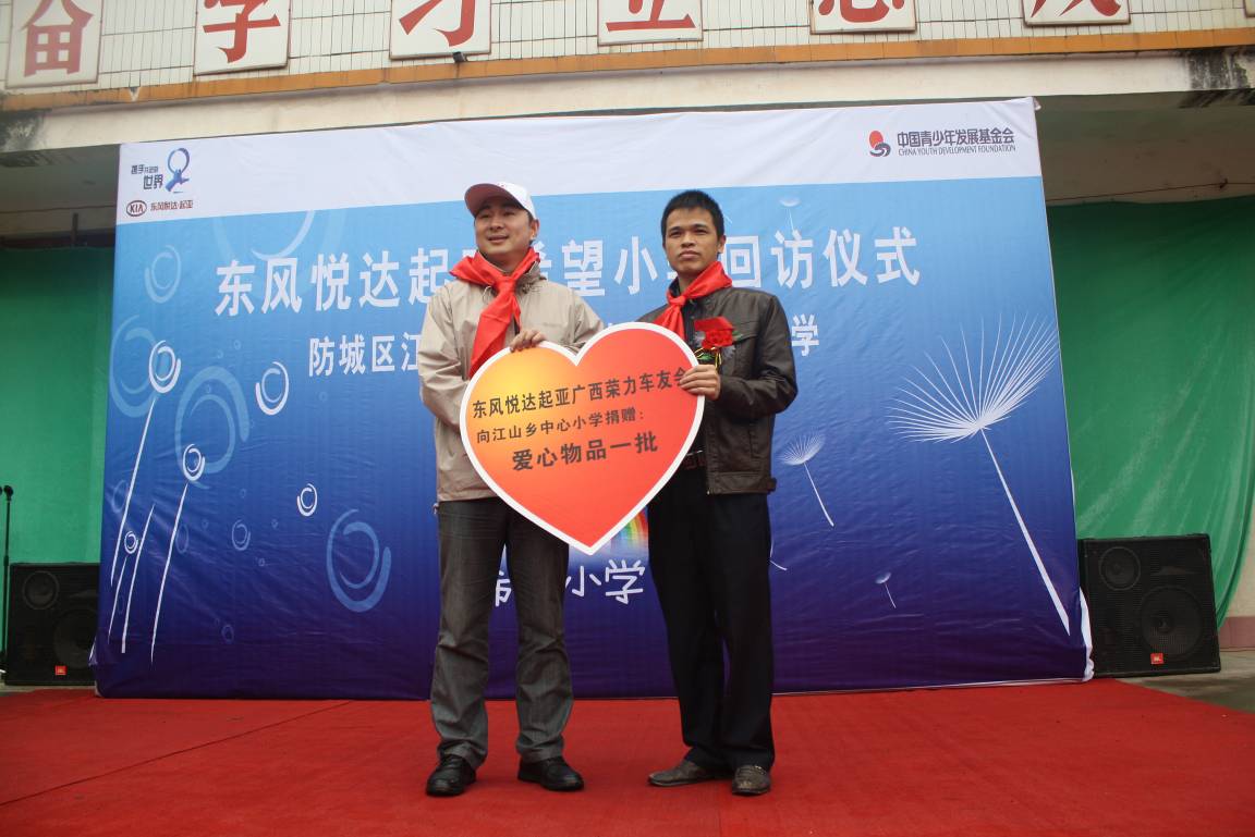 3月23日,由東風悅達起亞汽車有限公司捐資援建的廣西省防城港市江山鄉(xiāng)中心小學東風悅達起亞希望小學舉行了隆重的回訪儀式。防城港市領導、防城港市教育局領導、中國青少年發(fā)展基金會領導、東風悅達起亞公關部部長 吉同順、東風悅達起亞汽車有限公司廣州商務代表處首席代表童兵、東風悅達起亞汽車有限公司廣州商務代表處銷售督導 白曉強、東風悅達起亞南寧榮力4S店總經理李銘、廣西榮力車友會的車友們以及江山鄉(xiāng)東風悅達起亞希望小學全體師生和各大媒體共同參加了本次儀式。