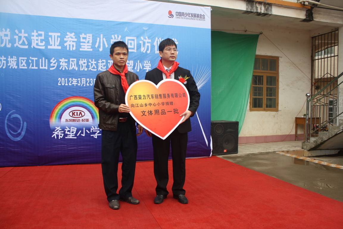 東風悅達起亞廣西榮力4S店總經理李銘代表榮力公司向希望小學捐贈文體用品一批。
