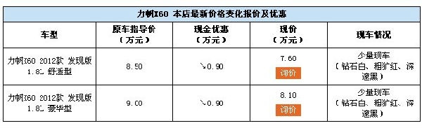 近日,開天力帆店內(nèi)力帆X60現(xiàn)車銷售,顏色可選,目前購車部分車型可優(yōu)惠0.9萬元,感興趣的朋友可以到店咨詢購買,詳情見下表: