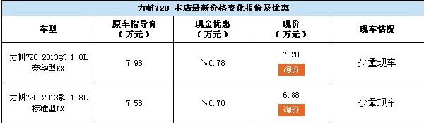 開天力帆店內(nèi)力帆720現(xiàn)車銷售,顏色可選,目前正在火熱預(yù)定,購車部分車型可優(yōu)惠0.78萬元,感興趣的朋友可以到店咨詢購買,詳情見下表: