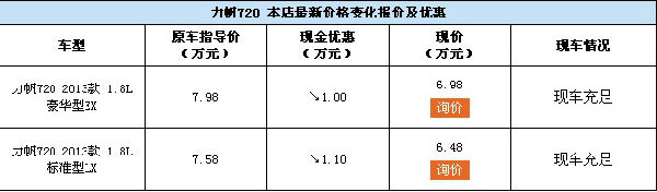 近日,開(kāi)天力帆店內(nèi)力帆720現(xiàn)車銷售,顏色可選,目前購(gòu)車部分車型可優(yōu)惠1.1萬(wàn)元,感興趣的朋友可以到店咨詢購(gòu)買,詳情見(jiàn)下表:
