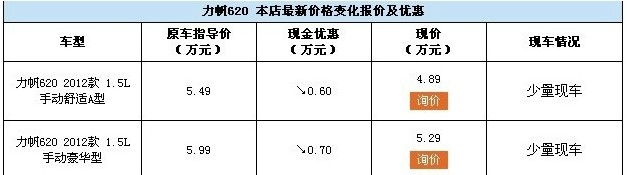 近日,開天力帆店內(nèi)力帆620現(xiàn)車銷售,顏色可選,目前購車部分車型可優(yōu)惠0.3萬元,感興趣的朋友可以到店咨詢購買,詳情見下表: