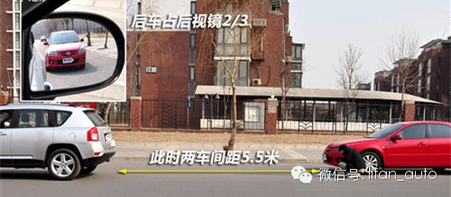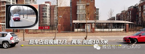 后車(chē)充滿(mǎn)后視鏡1/3,距離為10.5米—11.7米,在日常行車(chē)時(shí)這樣的距離基本算是比較安全的距離。